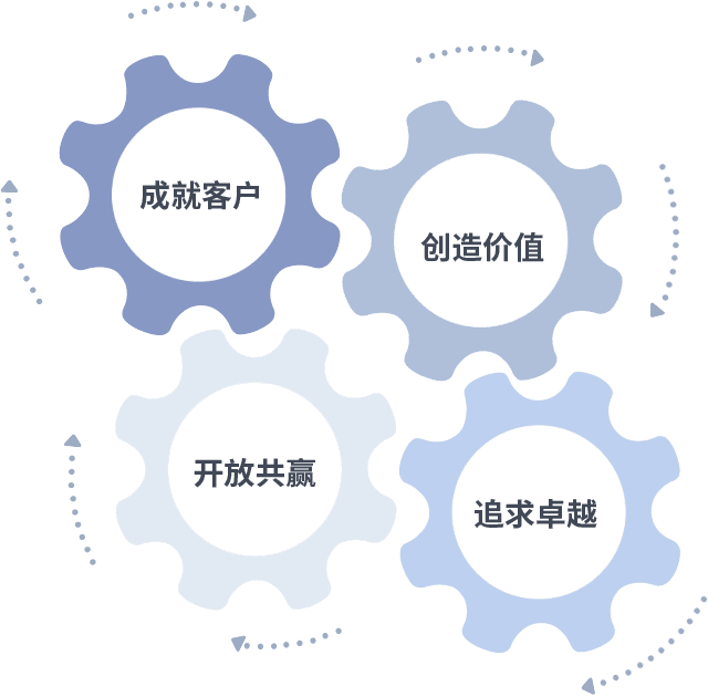 成就客户是一切决策的出发点,,,,创造价值是衡量所有工作的标准,,追求卓越是我们做事做人的态度,,,,开放共赢是我们的格局也是最终的结果。。。。价值观的齿轮环环相扣,,,,推动着组织里的每个人不断向前。。。。