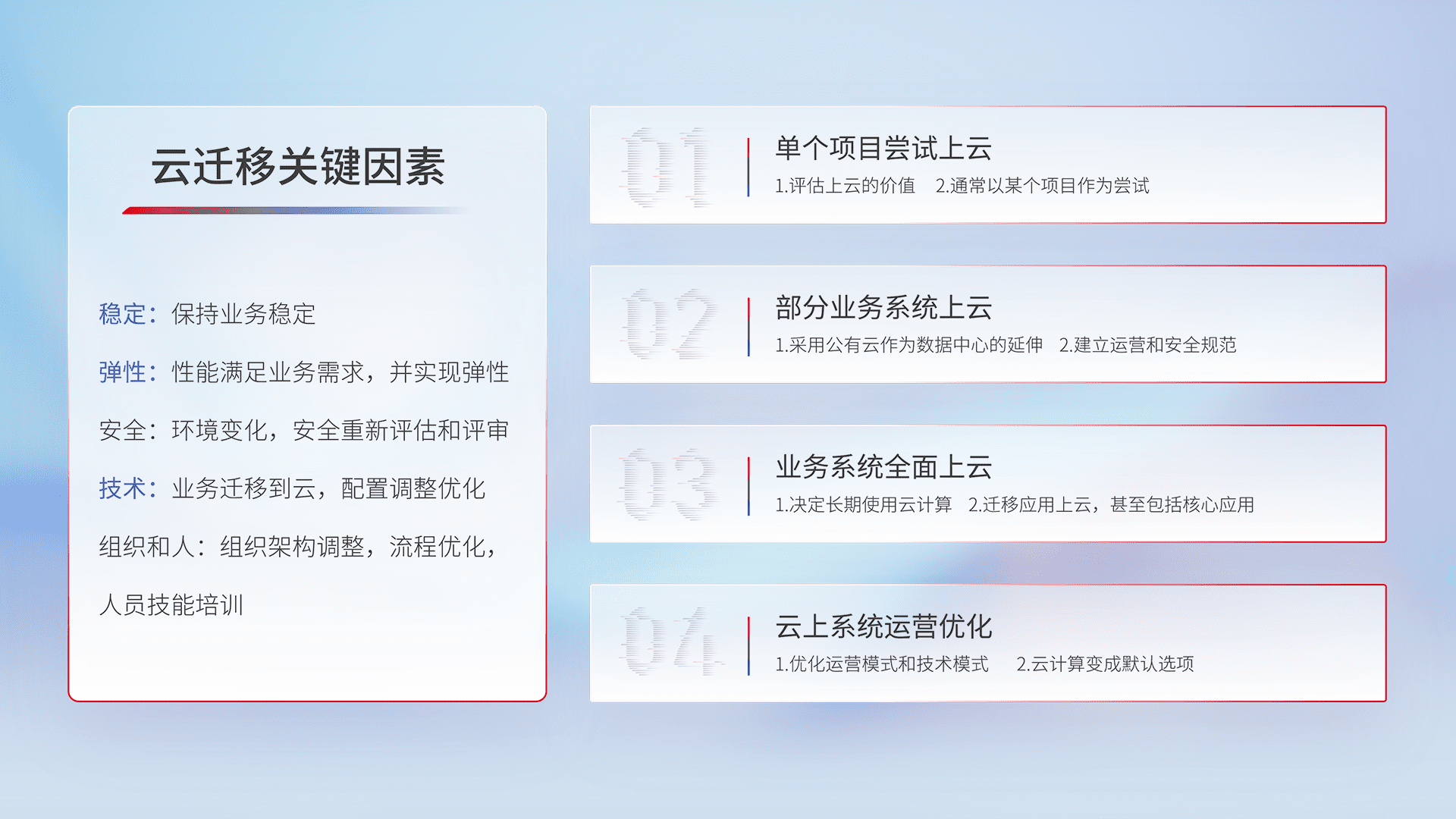 结合实际业务,,,,从规划设计、、云平台选型、、、、云原生改造、、、数据迁移、、集成交付,,迁移全过程为客户识别最佳上云路径,,,做好风险识别管理,,,,设计网络架构、、、身份权限、、、安全审计合规、、操作审计、、日志审计、、、、监控告警策略、、多站点容灾设计等,,,对云上基础设施进行整体规划,,提升IT治理水平,,,以满足弹性、、高可用、、、高性能的需求。。。
